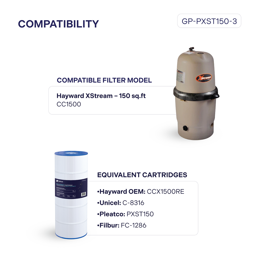 The GoPool Replacement Cartridge - Hayward XStream 150 sq ft CC1500 (CCX1500RE) is designed to provide effective and consistent filtration of your pool water. Specifically compatible with the Hayward XStream 150 sq ft CC1500 filter model, this cartridge efficiently traps fine impurities, debris, and suspended particles to keep the water clear and healthy. Made from a high-quality polyester filter media, it delivers performance equivalent to the original cartridge while offering excellent durability. Easy to install and simple to clean, the GoPool cartridge is a reliable and cost-effective solution to replace a worn cartridge and optimize your filtration system’s efficiency.